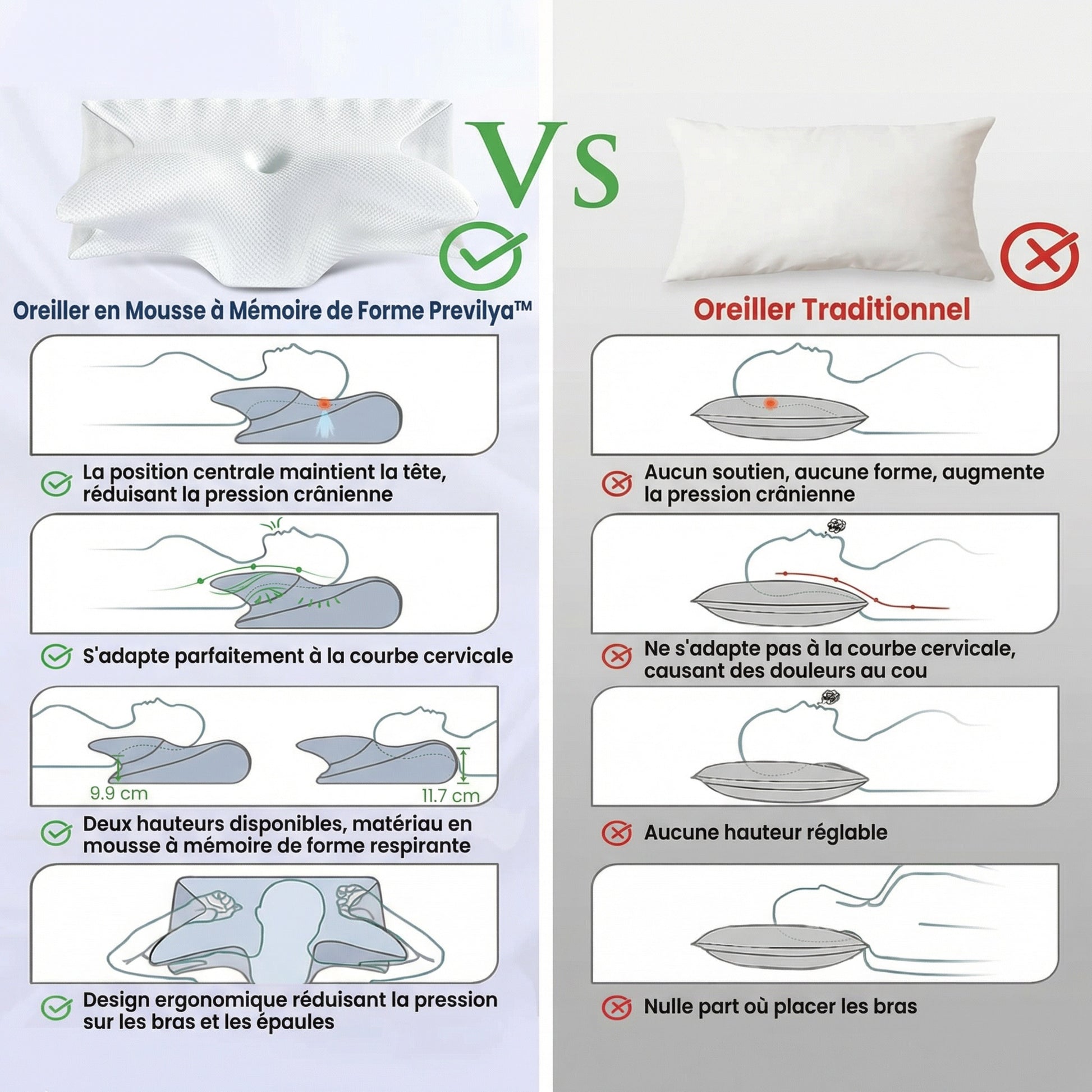 L'oreiller Previlya™ est le seul à avoir été cliniquement validé et conçu par des chiropraticiens pour améliorer l'alignement de la colonne vertébrale et soulager les douleurs cervicales, dorsales et des épaules. C'est la solution idéale pour toutes les positions de sommeil, vous offrant un sommeil réparateur et sans douleur.
